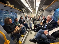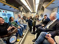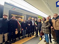 Ricostruzione post alluvione. La linea ferroviaria Faentina torna interamente percorribile. Viaggio inaugurale in treno del presidente della Regione Emilia-Romagna Michele de Pascale con la sottosegretaria alla Presidenza con delega alla Protezione civile, Manuela Rontini, e l’assessora a Mobilità, Trasporti e Infrastrutture, Irene Priolo e il presidente della Regione Toscana, Eugenio Giani.